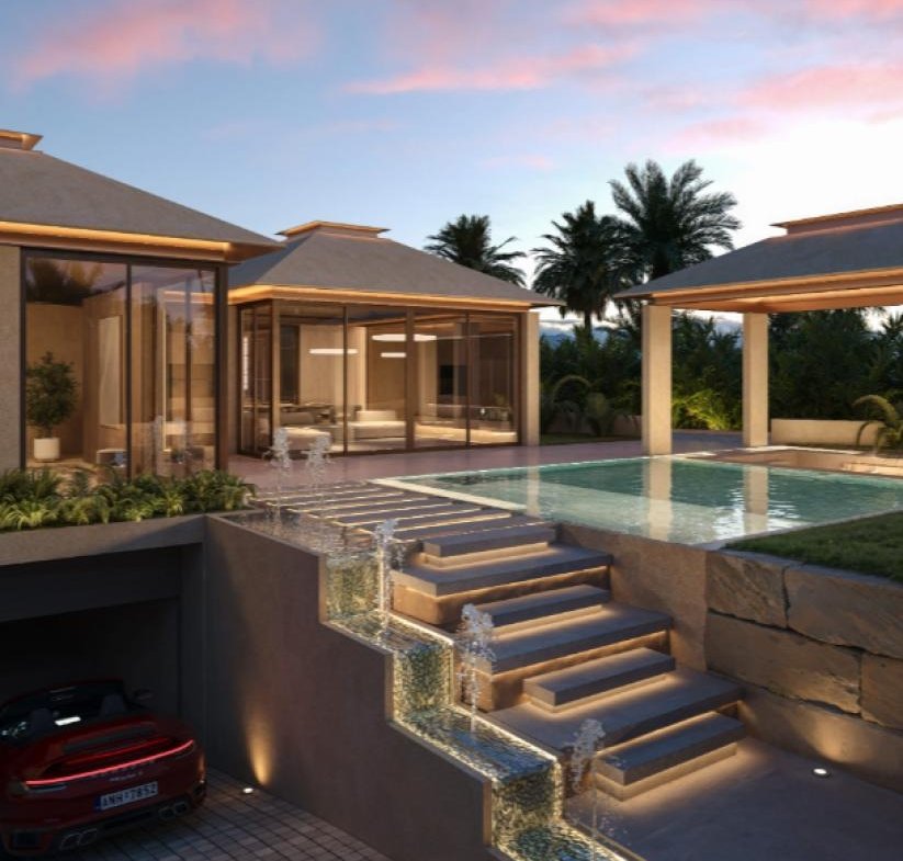 The villa features five spacious bedrooms, all with en-suite bathrooms, plus two additional guest toilets, distributed over two levels to offer maximum privacy and functionality. The master suite stands out with its expansive dressing room, designer bathroom, and relaxing views of the garden and pool.